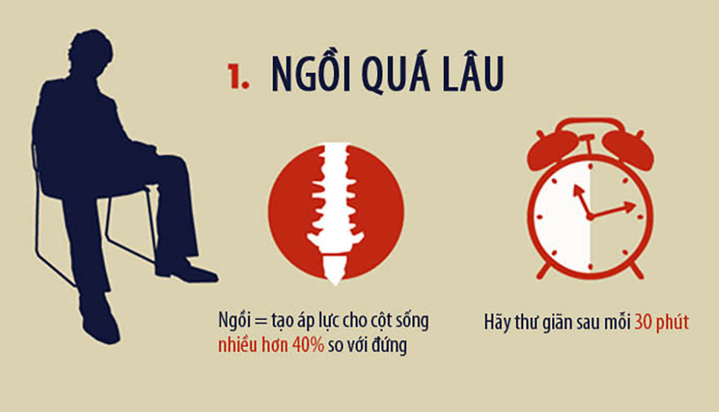 Thói quen này đặc biệt rất thường gặp ở những người làm công việc văn phòng, các công việc thủ công, tài xế, phi công,… Ngoài ra có nhiều người còn có thói quen ngồi thường xuyên khi rảnh rỗi. Tuy nhiên các chuyên gia cho biết, thói quen này sẽ vô tình khiến cột sống của bạn luôn trong tình trạng phải nâng đỡ cơ thể liên tục, các đĩa đệm đốt sống cũng bị chèn ép nhiều hơn. Do đó còn có thể gây ra thoát vị đĩa đệm. Người thường xuyên ngồi một chỗ có đến 50% nguy cơ đau lưng gia tăng so với người vận động cơ bắp mỗi 30 phút.