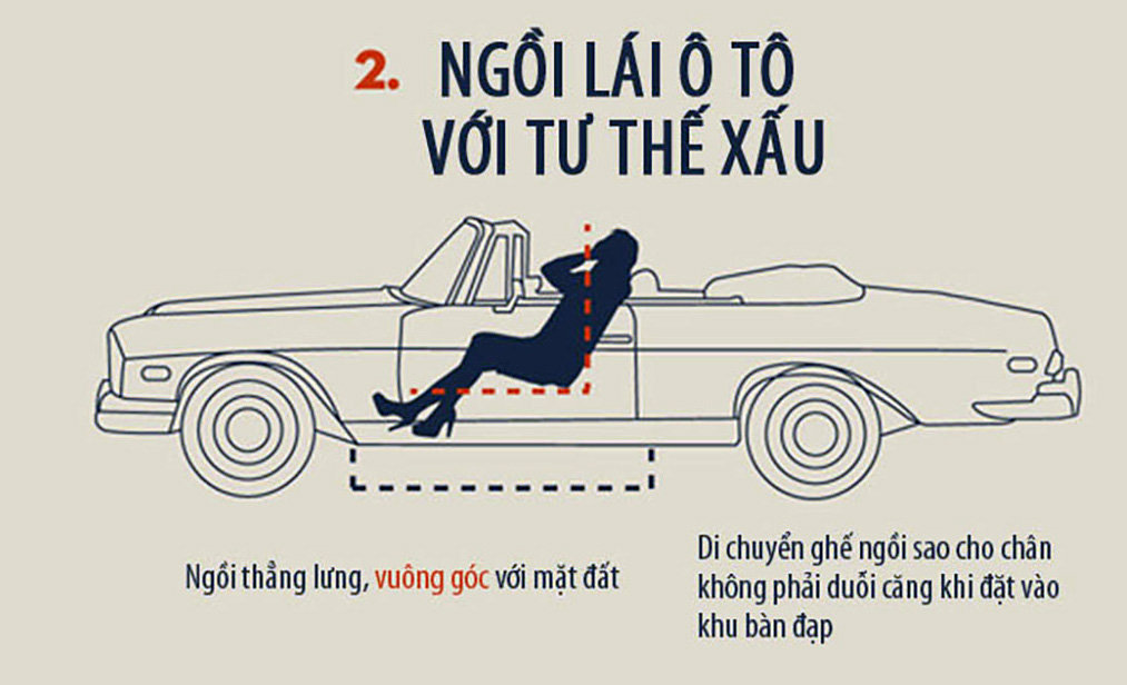 Tương tự như thói quen ngồi một chỗ, thói quen ngồi lái xe không đúng tư thế trong thời gian dài cũng gây tổn thương dần đến cột sống của bạn. Các chuyên gia khuyến cáo, bạn nên chú ý ngồi thẳng, lưng vuông góc với mặt đất để bảo vệ tốt nhất cho cột sống sẽ tránh bị đau mỏi trong thời gian dài.