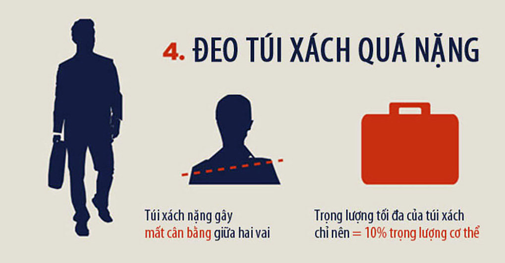 Học sinh, sinh viên thường có thói quen đeo cặp, đeo túi quá nặng, điều này rất ảnh hưởng đến cơ thể bạn, vừa gây lệch vai, lưng, vừa khiến cho cột sống và cơ thể mất cân bằng. Đeo cặp túi quá nặng ở học sinh trong độ tuổi đang phát triển có thể ảnh hưởng đến dáng đi sau này.