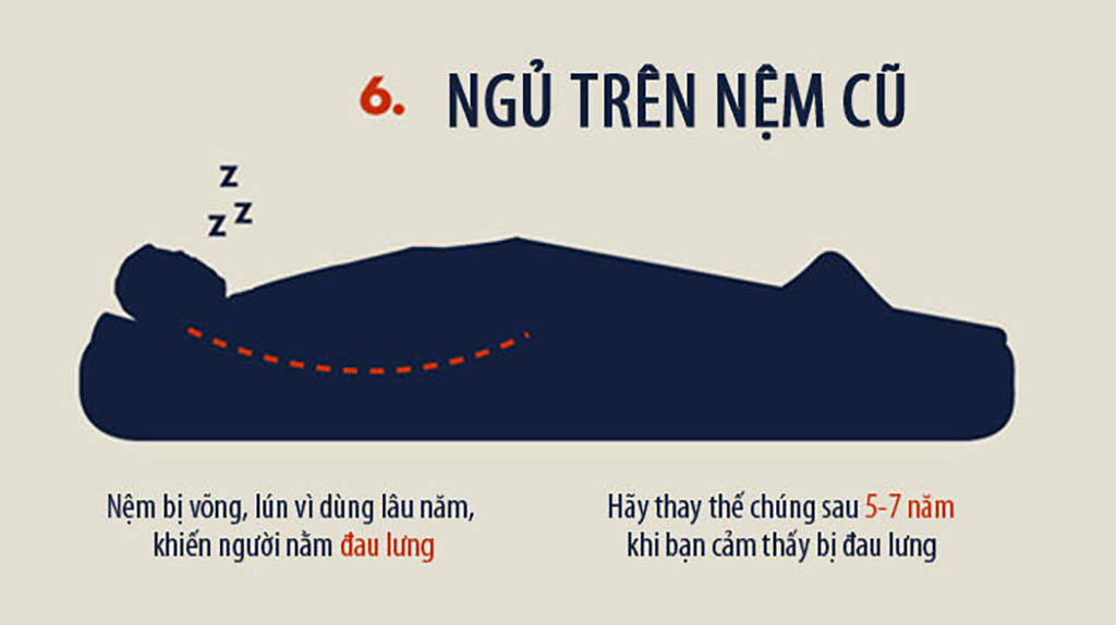 Đệm bông gòn, đệm mút cũ dễ bị lún, khiến cột sống của bạn không được nâng đỡ tốt khi ngủ khiến cho những cơn đau lưng nặng nề hơn. Bạn nên dùng đệm cao su cứng để nâng đỡ lưng tốt hơn hoặc thay đệm cũ sau 5 – 7 năm.
