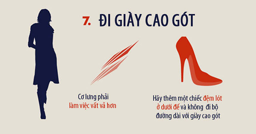 Giày cao gót rất phổ biến ở phụ nữ. Tuy nhiên thói quen đi giày cao gót cũng khiến cơ lưng phải gồng nhiều hơn để giữ thăng bằng. Điều này ảnh hưởng trực tiếp đến lưng và cột sống của bạn, dễ gây ra những cơn đau. Hạn chế đi bộ đường dài với giày cao gót hoặc thêm một lớp đệm lót dưới đế giày là những cách giảm ảnh hưởng cột sống của bạn.