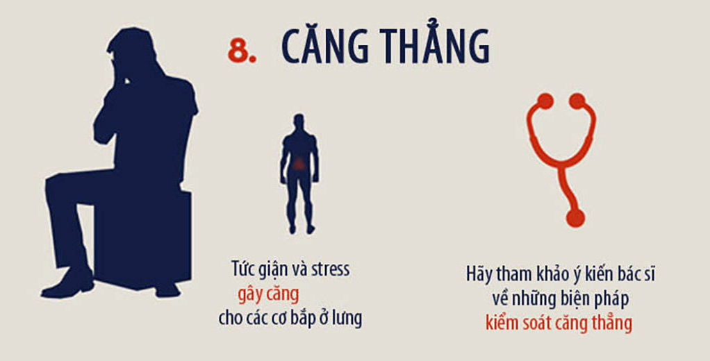 Các nghiên cứu từ lâu đã chỉ ra stress, căng thẳng rất có hại cho sức khỏe. Đối với lưng và xương khớp, khi căng thẳng cũng có thể khiến cơ bắp ở khu vực này căng theo, gây ra tình trạng đau lưng kéo dài. Stress còn dẫn đến nhiều bệnh như trầm cảm, đau dạ dày, bệnh huyết áp, tim mạch,…