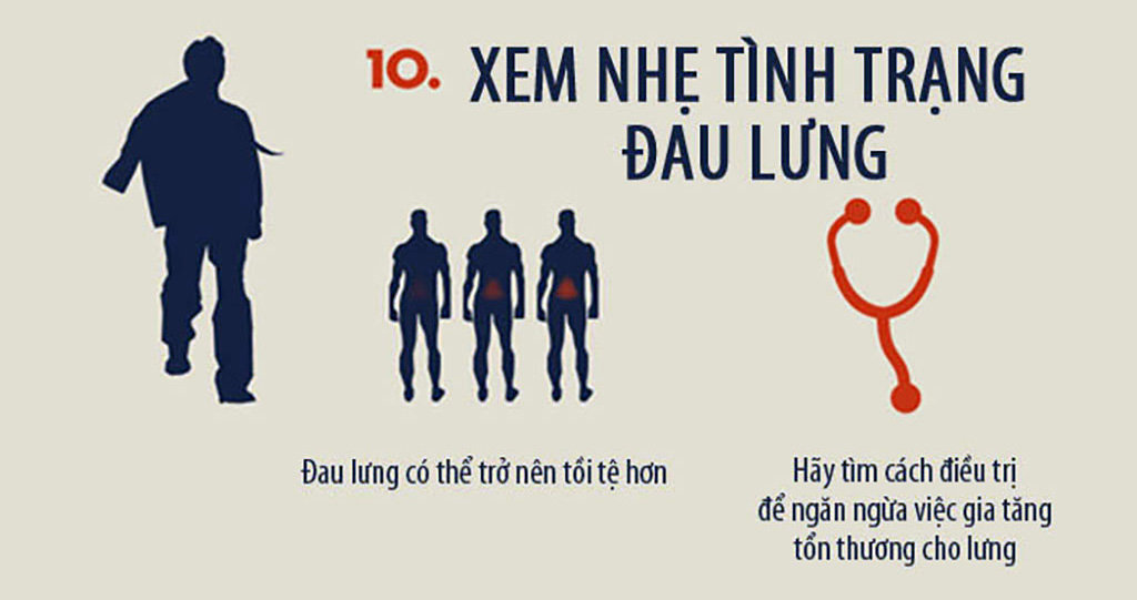 Thói quen này rất thường gặp trong cuộc sống. Có nhiều người rất xem thường tình trạng đau lưng của mình khi mới xảy ra. Tình trạng này kéo dài sẽ dẫn đến các vấn đề sức khỏe tiêu cực. Những cơn đau lưng sẽ kéo dài nếu bạn bỏ bê sức khỏe xương khớp của mình.