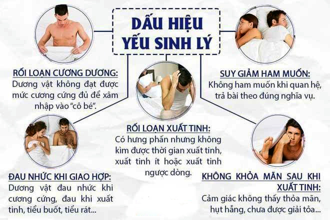 Yếu sinh lý không phải một bệnh mà là hội chứng biểu hiện gồm rất nhiều triệu chứng. Thường hay gặp nhất là: giảm hoặc mất khoái cảm khi quan hệ tình dục, rối loạn cương dương, trục trặc khi xuất tinh, đau khi xuất tinh hoặc đái buốt sau xuất tinh, mãn dục nam.