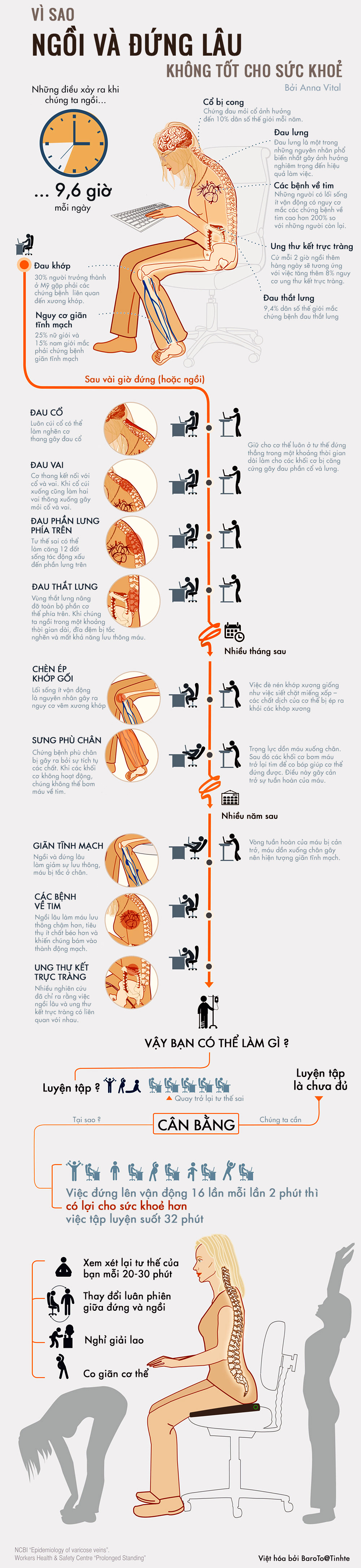 Bản thân việc đứng hay ngồi đều không có hại, chỉ khi chúng ta ngồi lâu hay đứng lâu mới tác động xấu đến sức khoẻ. Vậy những tác động đó là gì và làm sao để khắc phục được những nguy cơ gây bệnh này? Chúng ta cùng tìm hiểu qua Infographic dưới đây