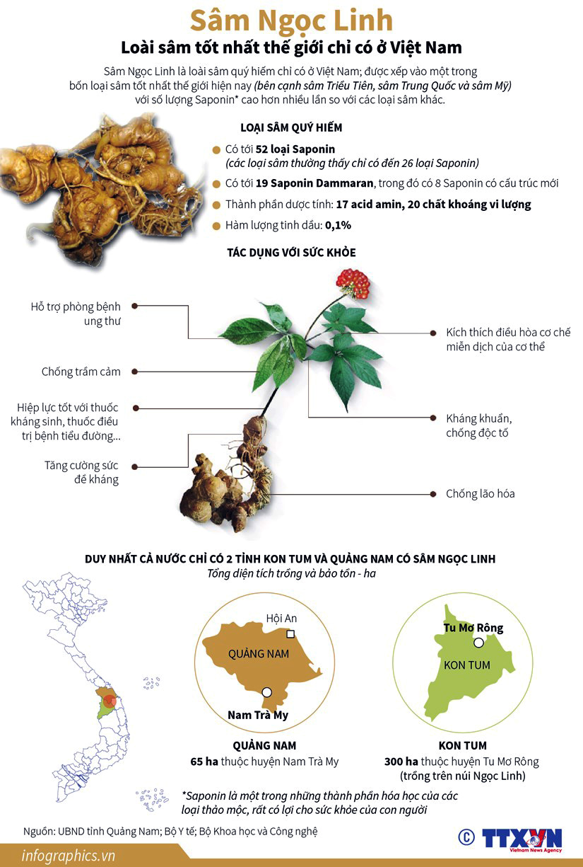 Chỉ có duy nhất ở Việt Nam, sâm Ngọc Linh quý hiếm bởi nó chứa tới 52 loại Saponin, cao gấp đôi so với các loại sâm quý khác của Hàn Quốc, Trung Quốc và Mỹ.